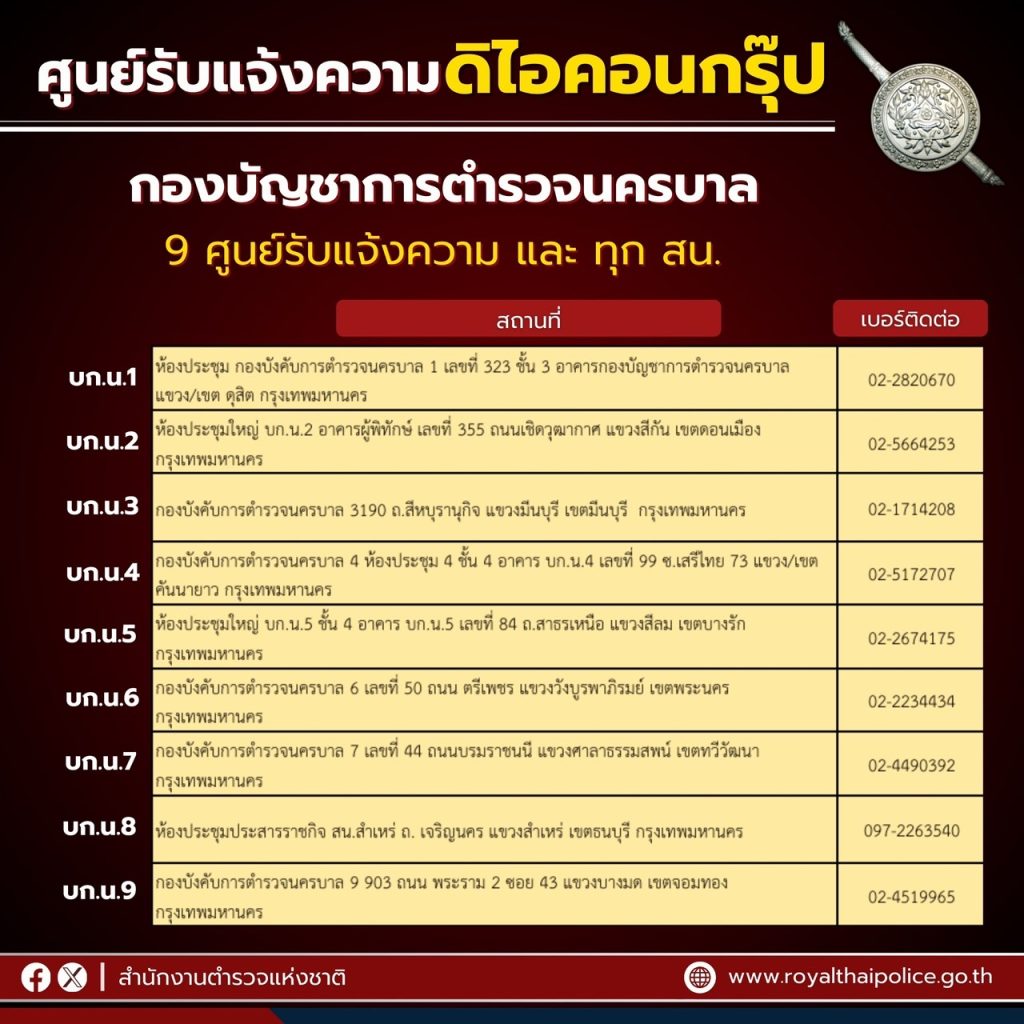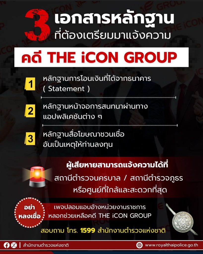 สำนักงานตำรวจแห่งชาติเปิด “ศูนย์รับแจ้งความ คดี THE iCON GROUP” ทั่วประเทศ 9 ศูนย์ใน กทม. พื้นที่ดูแลของกองบัญชาการตำรวจนครบาล และ 76 ศูนย์ ทุกจังหวัดในพื้นที่การดูแลของตำรวจภูธรภาค 1 – 9 เพื่ออำนวยความสะดวกให้แก่ประชาชนผู้เสียหาย และลดความยุ่งยากในการแจ้งความ